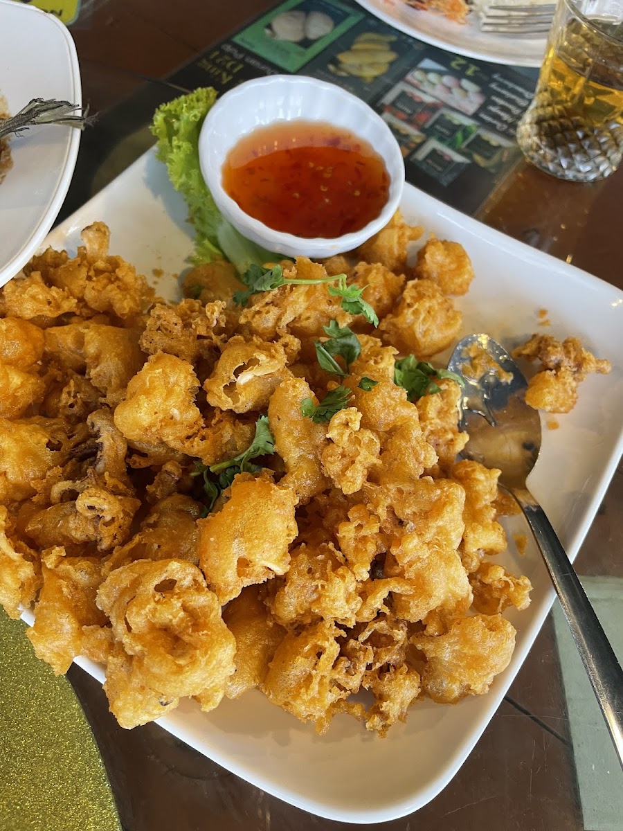 Nice little restaurant by the sea. Service was good and staff were friendly. We ordered the spicy clams , chilli squid and the tiger prawns , which were amazing. All the food was delicious and a nice place to come to eat away from all the busy areas. Nice fresh fruit juices also. Great service especially from Myra. Will come back thank you.